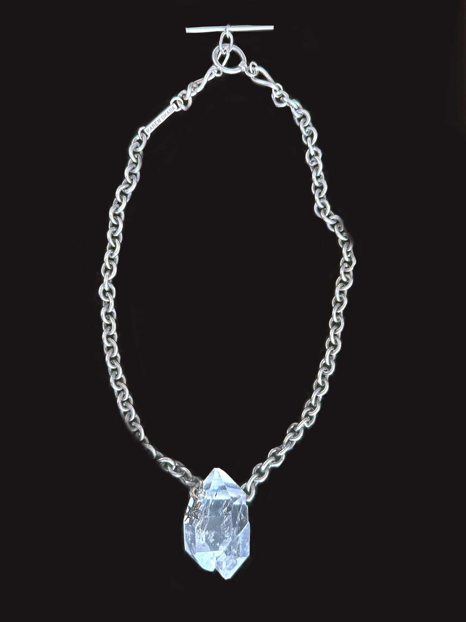 This is an incredibly clear Tibetan quartz crystal that is naturally formed, not polished, with a small fractionation (two crystals growing together.) This quartz crystal is on a chunky vintage sterling silver link chain with a black diamond star.